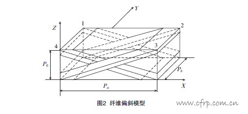 由于編織復合材料的基礎是紡織技術,對三維編織復合材料的研究,首先必須搞清楚紡織物結構的幾何模型[4]。美國是研究編織復合材料最早的國家之一。20世紀80年代比較典型的幾何模型當屬美國編織技術的先驅Frank K. Ko和Tsu-Wei Chou及其合作者最先提出的3 種幾何模型:第1種是Ko和Pastore[5]基于三維編織物中的紗線片段提出的一種單元胞體的“取向平均模型”,第2種稱之為“‘米’字枝狀模型”,Ma和Yang等[6]把四步法編織復合材料的單元胞體結構看成是由3根相互正交的紗線和4根對角紗線所組成,針對這些紗線的相互作用建立了細觀分析模型;第3種是Yang和Ma 等[7]的“纖維傾斜模型”。Yang等以由四步法編織的四向編織復合材料為對象,根據其預成形件內纖維束的排列為鋸齒形的特點,建立了纖維偏斜模型。認為在單胞內纖維束沿長方體的4個對角線方向排列,在注入基體后形成一個薄的斜板,4個偏斜的單向板形成一個單元,如圖2所示。