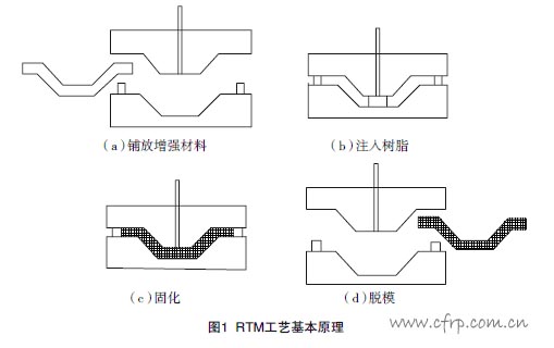 RTM成型工藝是先在模腔內預先鋪放增強材料預成形體,芯材和預埋件,然后在壓力或真空作用力下將樹脂注入閉合模腔,浸潤纖維,固化后脫模,再進行二次加工等后處理工序,其基本原理如圖1所示。