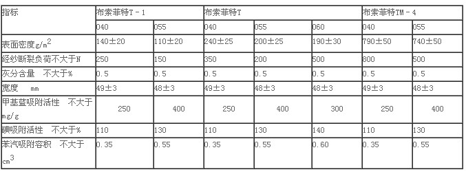 粘膠活性碳纖維有很強的吸附性,遠遠勝過活性碳。光明山“化纖”的活性碳纖維技術指標如下:單纖直徑6–10微米,比表面積700–2000 m2/g,吸附孔容積0.3–0.9cm3/g,單位電阻0.02–2歐姆.cm。用粘膠技術絲碳化–活化之后制成碳纖維吸附過濾材料,名叫“布索菲特”,分為條子,織物,非織造物,其中織物有3種,厚度0.2–1.5mm。技術指標見表2。可以將布索菲特T–1和T各兩層,組成TM–4,即四層材料。布索菲特吸附過濾材料用于吸附廢水、污水中的有機有毒物質(zhì),用于封閉系統(tǒng)內(nèi)的空氣凈化,個人防毒吸附裝置等。