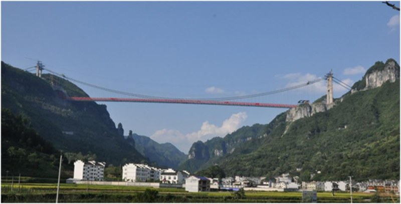 矮寨特大懸索橋是長沙至重慶公路通道吉茶高速公路的控制性工程,距吉首市約20公里,在矮寨鎮(zhèn)上空355米處跨越德夯大峽谷,主跨跨徑1176米,是目前世界上跨峽谷跨徑最大的鋼桁梁懸索橋。大橋地處峽谷,峽谷總體呈V字型,兩側(cè)懸崖距離從900m到1300m變化,平均坡度達(dá)40度,最陡處懸崖直立,施工場地十分狹小,而且橋面與谷底垂直高差達(dá)330余米,施工難度大。也由此創(chuàng)下“四項(xiàng)世界第一”。
