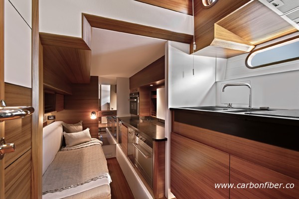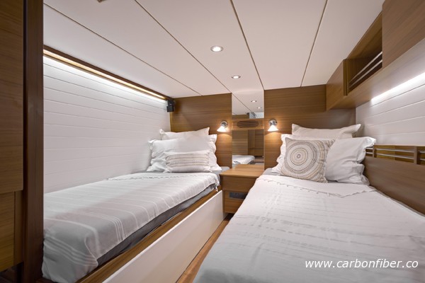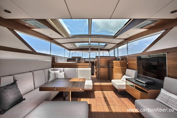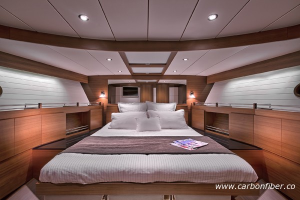 據(jù)了解,目前市場(chǎng)上很多船都標(biāo)榜“碳纖維”,但事實(shí)上大部分都只有小區(qū)域用了碳纖維而其他區(qū)域只是一般的纖維組合。Delta 54 是全球第一艘100%使用碳纖維的游艇,除了船體外,室內(nèi)柜子門(mén)、隔艙板及地板等附屬設(shè)施均由碳纖維打造。