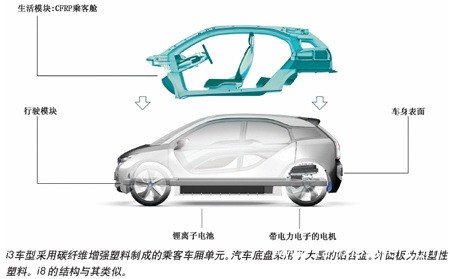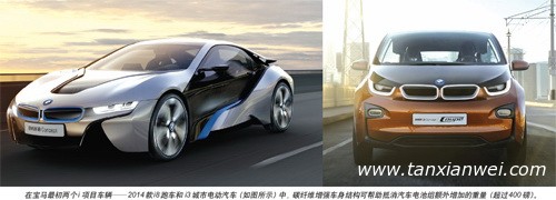 2014款寶馬i3電動汽車將于今年晚些時候將投入生產,總的目標是將其重量減輕200kg(440lb),來抵消電池重量。2014款i8車型——插電式混合動力跑車也將獲得相同的減重效果。一般來說,一輛車重量減輕100kg(220lb),二氧化碳排放量平均來看最高可降低10g/km。而這些車型(寶馬所謂Project i子品牌的首批車型)在乘客防護方面的性能都將受益于碳纖維優越的彈性模量及其拉伸強度——這兩個參數都超過硼鋼。