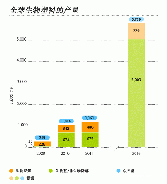 圖1:2011年生物降解塑料和生物基塑料的產能,及其2016年的產能預測(數據來源:歐洲生物塑料協會、漢諾威大學應用科學和藝術學院、IfBB—生物塑料和生物復合材料學會) 123,123