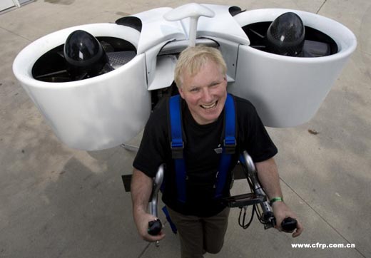 這種叫做Jetpack的個人飛行器是由格倫.馬丁發明的。他從1980年代就開始設計這種裝置,還在1998年成立了一家公司專門進行技術改進和制造。在2003年獲得了風險投資后不久,Martin Jetpack公司發布了原型機,并且在2008年生產出了成品?,F在,終于可以商業化了。