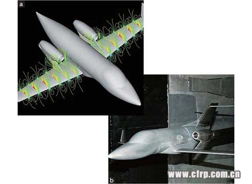 在微調引擎位置的同時,通過反覆進行數值模擬(a)和風洞實驗(b)找到了最佳位置。