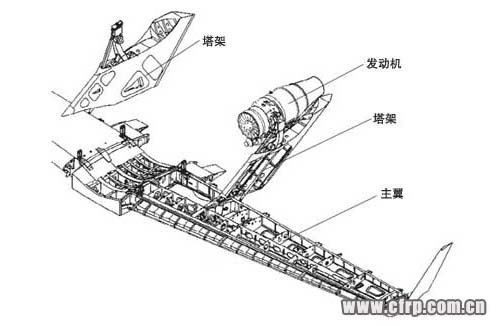 支撐引擎的塔架從主翼上表面後方向斜後方延伸。圖前方(機體左側)透視顯示了內部構造,後方(機體右側)的引擎圖上未標出。