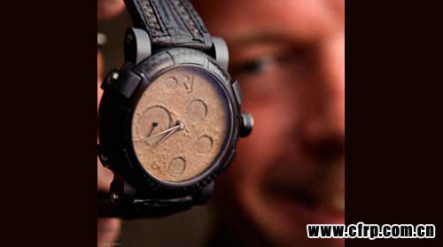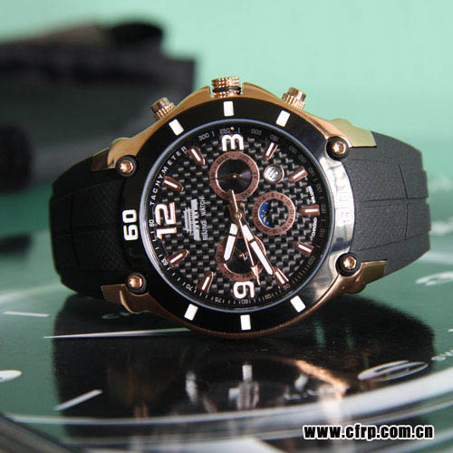 碳纖維手表除了材質(zhì)本身的魅力,在設(shè)計(jì)上也力求創(chuàng)意和精巧,將碳纖維優(yōu)勢(shì)由內(nèi)而外地發(fā)揮出來(lái)。在《Style Carve》雜志推薦的十款性感的男士碳纖維腕表中,位列第一、最受青睞的就是 布雷博(Brembo)的Quattro Valvole CCM。碳纖維的黑色經(jīng)典表面上,張揚(yáng)的兩黑兩紅共四個(gè)小表盤(pán)非常醒目。設(shè)計(jì)的靈感來(lái)自于四氣門(mén)發(fā)動(dòng)機(jī)的汽缸頭,在四個(gè)氣門(mén)的位置各自安裝了獨(dú)立的手表機(jī)芯。該款手表并不是布雷博自己推出的,而是聯(lián)合意大利著名手表廠商麥卡尼克·費(fèi)洛奇(Meccaniche Veloci)共同推出的,亮相于2009 巴塞爾鐘表展上,售價(jià)為15000美元左右。這款表的顏色也做了大膽的嘗試,除黑色外,還有黃色、紅色和銀色。