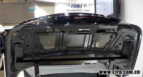此次東麗展示的是后備箱蓋內(nèi)側(cè)部件,通過粘合技術(shù)與外側(cè)的GFRP(玻璃纖維增強樹脂基復合材料)接合在一起。據(jù)東麗介紹,只有內(nèi)側(cè)部件采用CFRP是因為,這樣就已達到了后備箱蓋的輕量化目標,沒有必要再花費用連外板都改用CFRP。