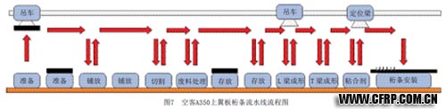 下面以空客A350XWB的機翼(圖6)翼板桁條生產線為例進行說明,德國空客施塔德(Stade)工廠負責生產的A350上翼板為空客迄今為止生產的最大的碳纖維復合材料整體零件,尺寸達31.6m×5.6m,重量達2t;其內表面安置的長短不一的碳纖維桁條,最長的接近30m,桁條總長度超過300m;并且按照空客的預想,施塔德工廠的翼板生產將來必須滿足每月生產7~13架A350客機的效率要求。