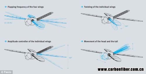 德國(guó)費(fèi)斯托公司研制的機(jī)器蜻蜓BionicOpter,翅膀采用碳纖維和箔材料,可使用手機(jī)進(jìn)行控制