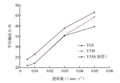 圖10為不同直徑的Y330( 涂層)刀具在相同鉆削參數下,鉆削碳纖維增強復合材料的平均軸向力曲線圖。
