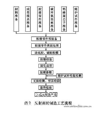 c波段天線主要由天線反射面及其它支撐結(jié)構(gòu)組成。本文著重介紹其反射面型面精度和尺寸穩(wěn)定性控制,根據(jù)我單位承擔(dān)某型號(hào)任務(wù)要求,其天線反射面的制造工藝流程,見圖2。