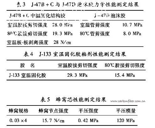 由于天線反射面必須能夠反射電磁波,蜂窩夾層結(jié)構(gòu)復(fù)合材料中面板材料必須由導(dǎo)電材料制成。碳纖維具有良好的導(dǎo)電性能,且具有良好的力學(xué)性能沿高模量碳纖維軸向的熱膨脹系數(shù)為-0.7x10-6/℃,而其垂直于纖維方向的熱膨服系數(shù)為23x10-6/℃。它具有明顯的各向異性特點(diǎn),可通過工藝設(shè)計(jì),滿足各種天線反射面的性能要求。實(shí)踐表明碳纖維是天線反射面面板材料的理想選擇之一。Kevlar-49纖維同樣具有良好的力學(xué)性能,從結(jié)構(gòu)性能角度考慮也是天線面板材料的理想選擇。但由于其不導(dǎo)電,當(dāng)用于天線反射面時(shí),必須對(duì)其反射表面進(jìn)行金屬化處理。由此可知,天線反射面的結(jié)構(gòu)設(shè)計(jì)與所用材料性能有著密切的關(guān)系。選用不同的材料會(huì)使天線反射面的結(jié)構(gòu)特性有很大的差異,為了滿足C波段天線結(jié)構(gòu)的設(shè)計(jì)要求,在進(jìn)行了大量的材料性能試驗(yàn)的前提下,最終選用材料的性能測(cè)試結(jié)果列于表1至表5中。