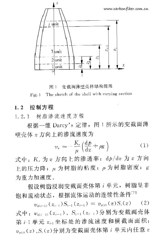 RTM充模的實(shí)質(zhì)是液體樹(shù)脂飽和充滿纖維預(yù)制件孔隙并排除其內(nèi)部所含空氣的過(guò)程??紤]到三維整體編織變截面薄壁殼體的厚度與其直徑和高度相比,數(shù)量級(jí)較小,且薄壁殼體KTM模具樹(shù)脂流道的設(shè)計(jì)一般采用環(huán)線注射結(jié)構(gòu)方式,因此樹(shù)脂充模過(guò)程中的流動(dòng)規(guī)律可近似為多孔介質(zhì)中的一維滲流,即在柱面坐標(biāo)系統(tǒng)(廠,夕,z)中,壓力和速度值僅沿z方向變化。分段一集合計(jì)算方法是根據(jù)制件截面形狀方程的種類(lèi)數(shù),沿軸線將殼體分成若干單元.利用Darcy分鐘定律依次計(jì)算出各單元段內(nèi)樹(shù)脂流體的運(yùn)功狀態(tài)參數(shù),經(jīng)過(guò)數(shù)學(xué)變換,求得變截面薄壁殼體內(nèi)不同位置的樹(shù)脂流動(dòng)速度場(chǎng)、壓力場(chǎng)、位移場(chǎng)和充模時(shí)間的分布規(guī)律。為簡(jiǎn)化薄壁殼體樹(shù)脂流動(dòng)的理論分析與計(jì)算,作如日限設(shè):充模過(guò)程中三維編織頂制件不會(huì)發(fā)生纖維移動(dòng)和變形;充模過(guò)程中不考慮由于化學(xué)反應(yīng)所引起的粘度變化,樹(shù)脂的粘度值為一定值;充模過(guò)程中僅考慮宏觀樹(shù)脂流動(dòng)現(xiàn)象.慣性和毛細(xì)作用忽略不計(jì);樹(shù)脂注人壓力為Po(zo)。行流動(dòng)前沿處壓力為0. 本文來(lái)自123