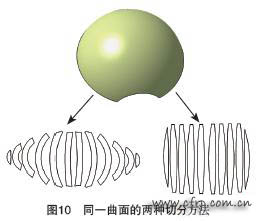 復合材料結構中承載纖維的關鍵是要連續和繃緊。有一種曲面鋪疊方法是將等高線做為基準,其具體做法是用一組平行的平面去切割曲面,將交線做為鋪層的基準方向并且作為小鋪層的拼接線。這種方法對于平面是正確的,但是對于曲面時就會出現問題,在鋪疊并排的小鋪層時會出現不規則形狀,在預浸料的邊緣出現大量的斷纖維,有的地方甚至所有的纖維都是斷的,這種現象會隨曲率的變化而加劇。顯然,斷了的纖維不能傳遞載荷,只有在垂直于切割平面的附近的纖維是連續的,這種方法不合理(圖9、圖10)。