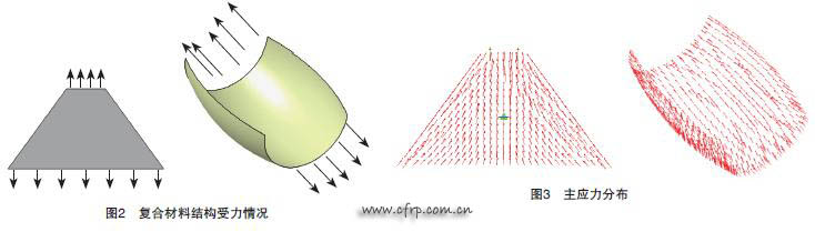 在復合材料結構中,纖維是主要承載材料,纖維只有在張緊狀態下才能承受最大載荷。纖維張緊時,其路徑是曲面上最短的,而曲面上最短的距離一定是測地線。因此,對于圖2中結構的某一層而言,以0°為例,結構的2 邊受到載荷時,這一層的每根纖維只有按照測地線分布和排列時,才能使得纖維繃緊并承受最大載荷,即與此點主應力一致(圖3)。