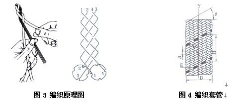 編織是一種古老的織造技術(shù)。編織物(braid)所有的纖維均斜交,與軸線夾角不呈0°與90°。編織原理與編織管如圖3、圖4所示。編織過程腫,纖維的運(yùn)動軌跡為螺旋線。選擇合理的纖維角度可調(diào)節(jié)成品管材徑向強(qiáng)度與軸向強(qiáng)度的比例;選擇適宜的纖維排列密度可滿足強(qiáng)度與外觀的要求。