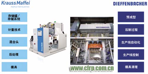 德國加工機械領域的專家迪芬巴赫公司(Dieffenbacher)和克勞斯瑪菲公司(KraussMaffei)在RTM技術領域展開了合作,他們對以上的市場需求做出了響應——開發了一條高壓樹脂傳遞模塑成型工藝(HP-RTM)的自動化生產線。這條生產系統包括了預成型加工、壓制過程,以及修整工藝。相比于傳統的RTM工藝,該HP-RTM工藝減少了樹脂注射次數,提高了預制件的浸漬質量,并縮短了成型周期。