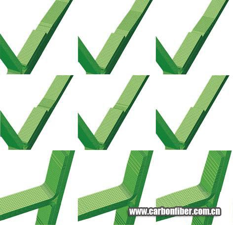 自動(dòng)建模算法須能根據(jù)一系列給定的幾何參數(shù)和鋪層參數(shù),為接頭內(nèi)每一鋪層(包括插層)和每一填充區(qū)構(gòu)建合理的分析網(wǎng)格,同時(shí)滿足各鋪層網(wǎng)格相互結(jié)合部的節(jié)點(diǎn)共有要求。此外,需能準(zhǔn)確構(gòu)建每個(gè)單元的材料坐標(biāo)系。圖4給出通過(guò)專門設(shè)計(jì)的算法,在模擬接頭突緣和突緣區(qū)底板內(nèi)部增減插層對(duì)承載能力影響作用的計(jì)算過(guò)程中,自動(dòng)生成了部分模型示意圖。