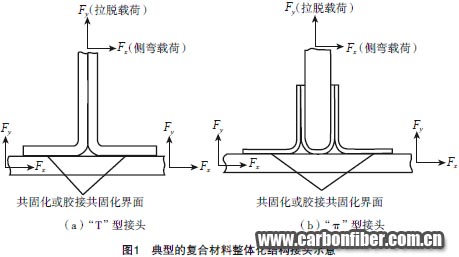 復(fù)合材料結(jié)構(gòu)件中,不同結(jié)構(gòu)組分可通過(guò)共固化或膠接共固化途徑結(jié)為一體,以取代緊固件連接方式。此狀態(tài)下,在共固化或膠接共固化界面周邊,形成一個(gè)特殊的接頭區(qū)。所謂復(fù)合材料整體化結(jié)構(gòu),即為內(nèi)含此類接頭的復(fù)合材料結(jié)構(gòu)型式,圖1給出了典型接頭及其載荷示意。