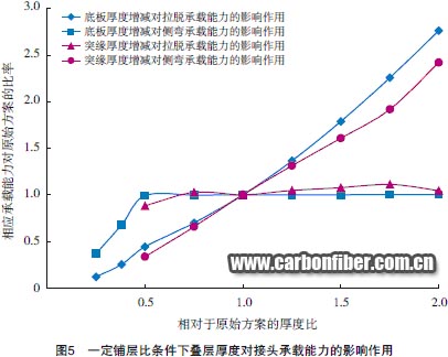 圖5為一原始接頭方案,在給定鋪層比條件下增減其填充區(qū)周邊突緣疊層厚度或底板疊層厚度,承載能力所受影響作用的模擬結(jié)果。可以看到,接頭結(jié)構(gòu)參數(shù)在一定范圍內(nèi)變化可對(duì)承載能力形成顯著影響,并且影響作用會(huì)隨載荷形式的不同而發(fā)生明顯差異。由于本文的綜述性質(zhì),此處不對(duì)影響作用的具體細(xì)節(jié)進(jìn)行討論,僅通過(guò)圖例表明其復(fù)雜性。同時(shí)表明,對(duì)于接頭的合理設(shè)計(jì),模擬結(jié)果可提供方向性的參數(shù)修正依據(jù)。