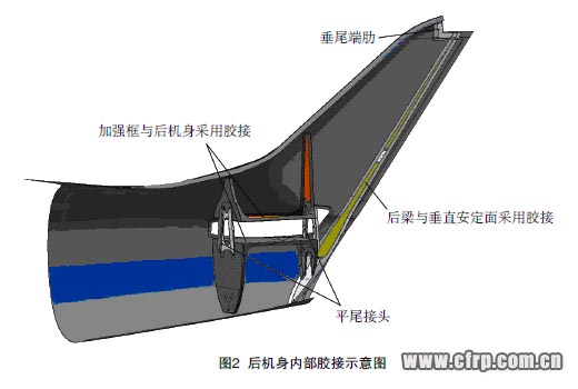 (1)后機身內有兩個加強框,由上下兩個碳纖維復合材料件與蒙皮及垂直安定面后梁膠接組成,垂直安定面內部有一個翼梁,采用碳纖維復合材料蜂窩夾層結構,采用膠接與蒙皮連接,如圖1、圖2所示。