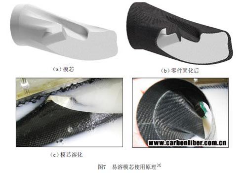 易溶模具是指采用在某種溶劑中易于溶解的材料運用澆鑄法或模壓法制成空心或?qū)嵭牡哪>?。?fù)合材料構(gòu)件依賴這種模具成型后,從開口處通入合適溫度的溶劑,使模具材料溶解進而從構(gòu)件中流出。低溶鹽和石膏是常用的芯模材料。另外,水溶性型芯材料也可由粘結(jié)劑和陶瓷填料組成,粘結(jié)劑為有機高分子材料,具有脫水固化、遇水溶解的可逆特性;陶瓷填料由氧化鋁和高嶺土組成,陶瓷料漿的固相體積分?jǐn)?shù)使粘結(jié)劑具有良好的水溶性和高的熱分解溫度[7]。圖7為易容模芯的使用原理。