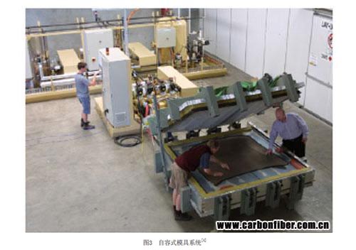 自容式模具(圖3)系統(tǒng),加熱和加壓是模具的一部分,熱源可以是電、熱油或蒸汽,能夠解決一些熱壓罐的不足之處,可以用來生產(chǎn)大于現(xiàn)有設(shè)備的零部件,且具有成本低、升壓速度快、溫度控制精確的優(yōu)點。
