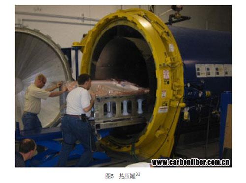 模具加熱系統(tǒng)主要分為:熱氣外部加熱,通常采用熱壓罐(圖5)或水壓罐加熱;模具本身或與模具緊密接觸臺板的電加熱;電加熱毯局部加熱;模具或臺板內(nèi)部的流體加熱,通常采用蒸汽或熱油;高速噴射氣流加熱系統(tǒng);微波加熱和感應(yīng)加熱系統(tǒng),主要用于小零件,對于較厚的層合板,可使其從內(nèi)到外發(fā)生固化。