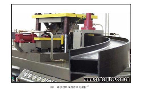 連續(xù)擠壓是一種多工步過程,其成型模具為組合式,多運動部件組成。首先多層熱塑性帶在模具中加熱并壓成層合板,而后將層合板壓入成型模具并加熱壓成所需截面的型材,最后將型材通過連續(xù)壓模壓成所需的彎曲形狀,這種方法可以成型彎曲甚至扭轉(zhuǎn)和變截面的型材零件,是一種新型的成型工藝。圖4為其成型模具和設(shè)備。