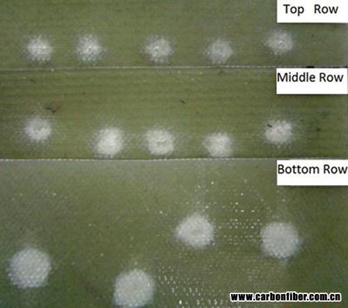 圖3 在采用鉤/環(huán)搭接的“互鎖型”Han-3D玻璃纖維織物(上)以及具有同樣重量的“非互鎖型”平織玻璃纖維織物(下)上所做的低速碰撞測(cè)試,兩種織物都是按0°、+45°、-45°、90°、0°、-45°、+45°和0°的順序依次鋪層、并由亨斯邁先進(jìn)材料公司的Aradur 5003-1環(huán)氧樹脂進(jìn)行真空灌注的一個(gè)8層織物。將試樣放入一個(gè)中心孔直徑為50mm的試驗(yàn)夾具中,采用一個(gè)頭部直徑為12.7mm的沖擊桿在試樣的多處擊打數(shù)次(落錘1kg,落差80cm)。可以看出,采用Han-3D織物生產(chǎn)的復(fù)合材料上的凹痕相對(duì)較小,中間一排顯示出了僅在試驗(yàn)夾具的落差由80cm降低到40cm后,平織的試樣上就出現(xiàn)了較小的凹痕印記