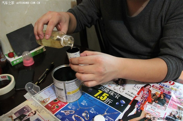 開始調配環氧樹脂膠,樹脂和固化劑的比例也要弄清楚,攪拌好之后,拿一個新刷子就可以刷膠了,刷環氧樹脂可以不用等,直接刷就是了,注意下面要用東西鋪好,膠會滴下來的。