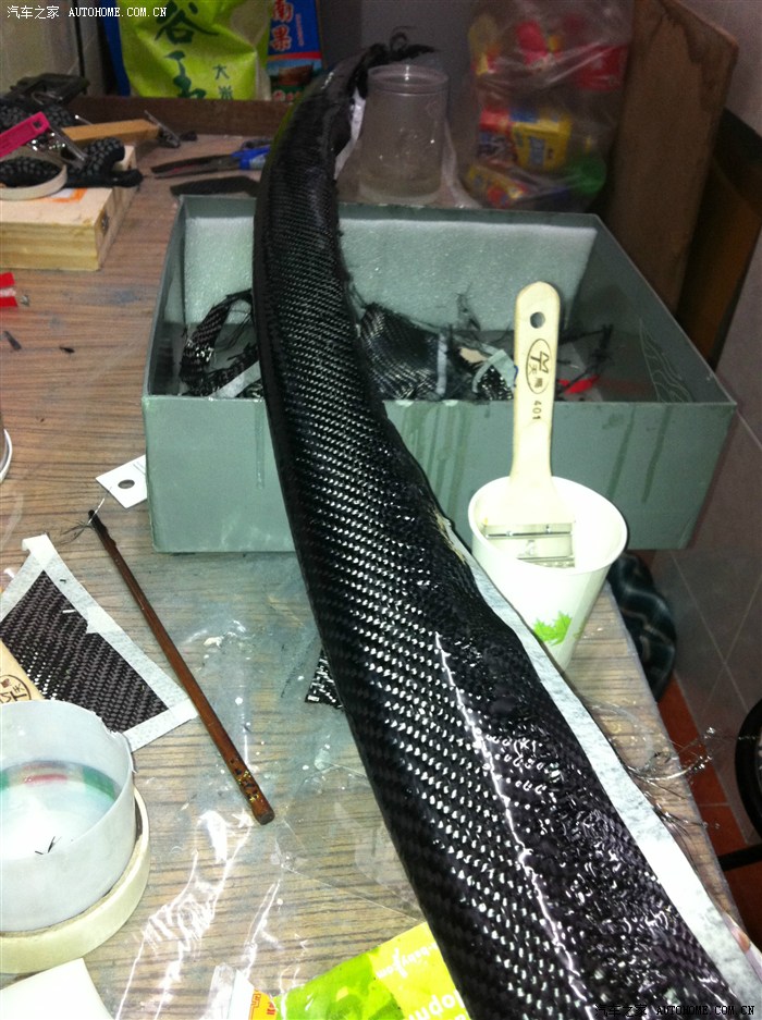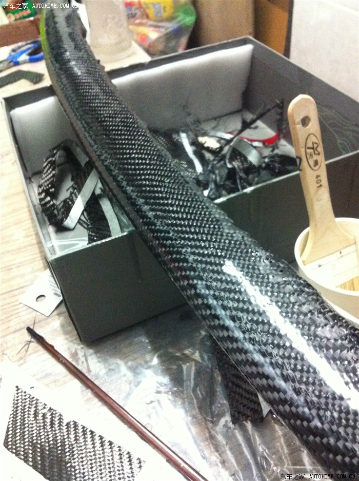 “車禍現場”兄弟,請看下面的幾個照片,尾翼制作過程中,包的雙層碳纖維,樹脂要刷好幾遍呢,這是第二層的第二遍,預計還要一周時間。